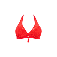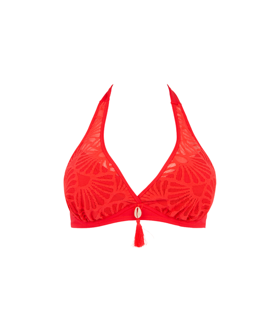 - Plunge halter bikini top - Met beugel - Diep decolleté - Cups drogen snel - Bandjes multipositioneerbaar - Bikini top in 1 kleur met daarop driehoek cups uit kant. - Kanten deel niet gedubbeld, transparant - Te strikken rond de hals.