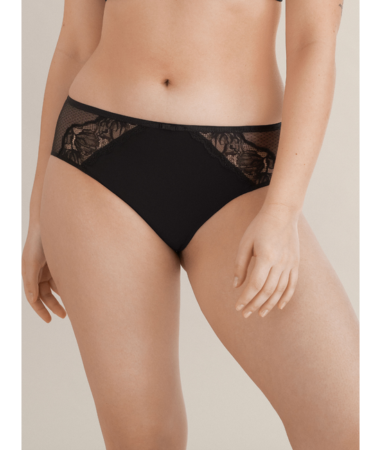 - Slip in zachte stof - Normale hoogte - Stretch kant opzij - Gesneden zoom op de billen - Zachte taillenband