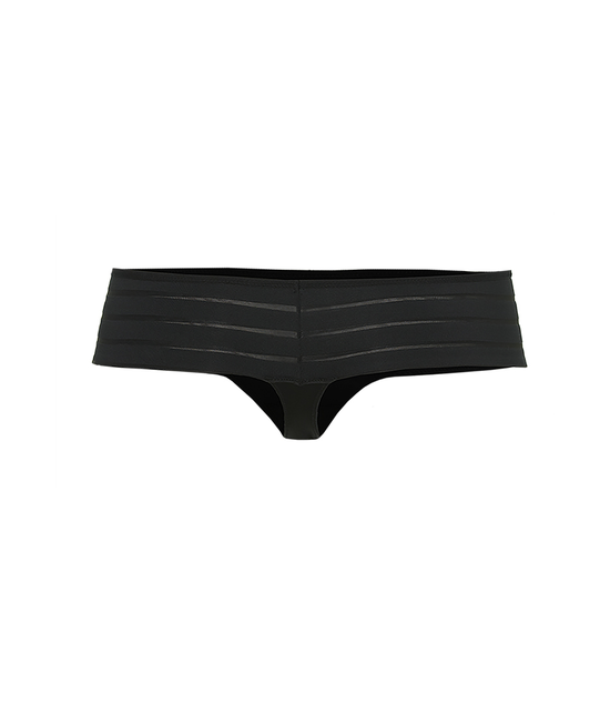 String uit de nieuwe basiscollectie van Sapph. De string is opzij doorzichtig gestreept. Vooraan is de string blikdicht.