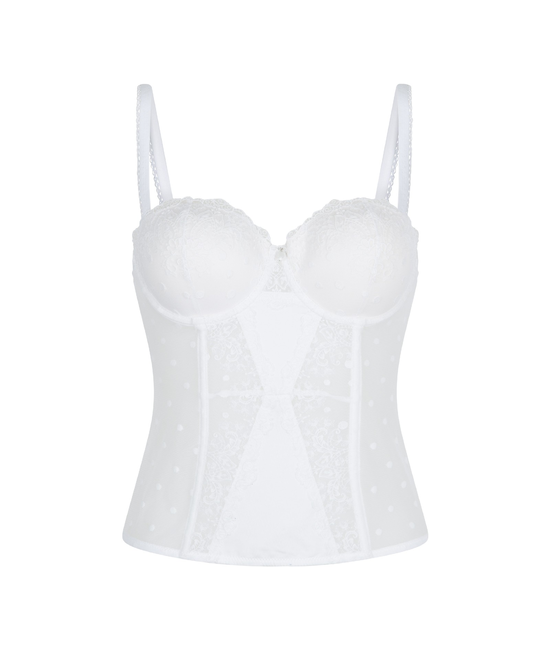 Labrya, Een mooie ivoorkleurige serie afgewerkt met delicaat kant, voor alle bruidjes to-be! Deze Guipiere is gemaakt in een mooie combinatie van kant met mesh. De guipiere heeft voorgevormde cups en heeft verstelbare schouderbandjes. Combineer met een bijpassend slipje uit de Labrya serie.