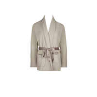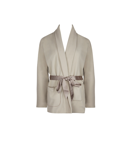 - Kamerjas in polaire met gordel aan taille. - Lengte onder de billen. - Gordel uit satijn lint - Zakjes vooraan