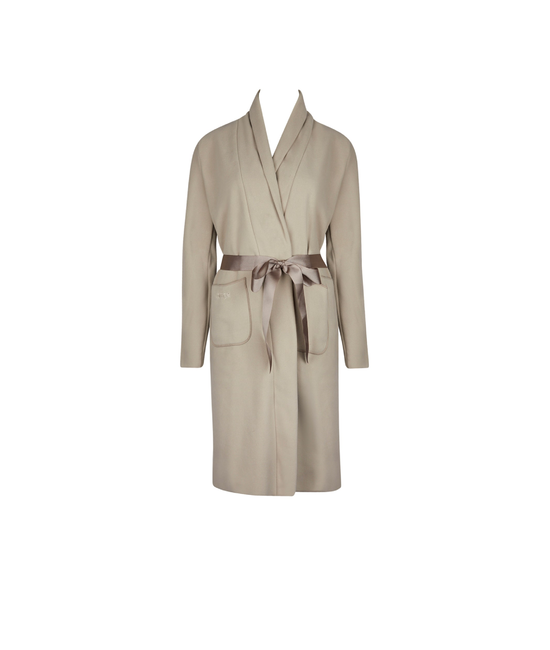- Kamerjas met gordel aan taille - Lengte boven de knie. - Ceintuur uit satijn zijde. - Zakjes vooraan