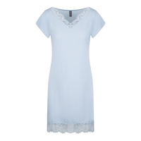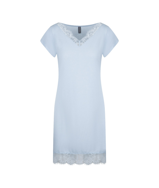 - Valt soepel - Korte mouwtjes - Met kant langs de v-hals - Met kant aan de onderkant