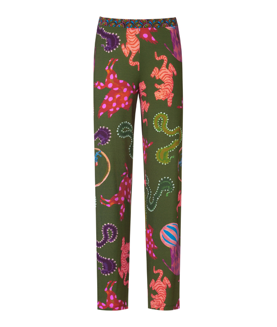 - Lange losse broek - Rechte snit - Comfortabele pasvorm - Elastische tailleband - All-over print met exotische circusdieren - Luxe glans - Zeer zachte stof